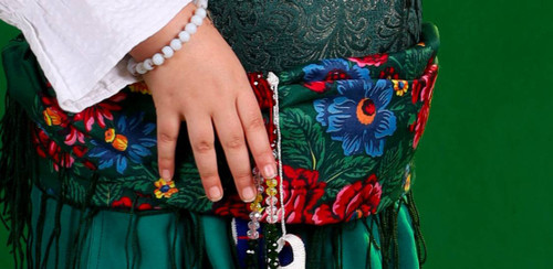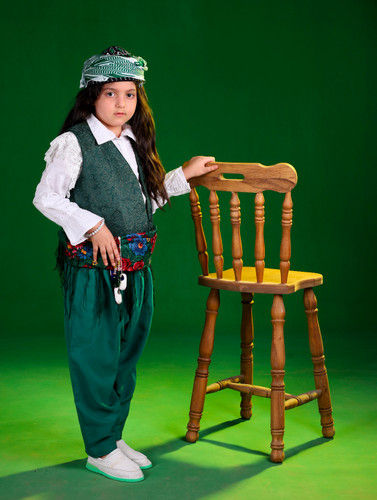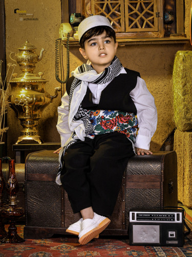 ست لباس کوردی جلیقه پشم نخ شلوار جنس مازاراتی کمربند کلاه دست باف شال دور کلاه